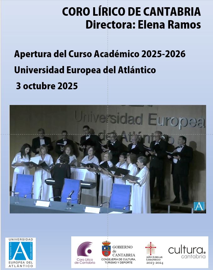 El Coro Lírico de Cantabria intervendrá en el solemne acto protocolario de Apertura del Curso Académico 2025-2026 de la Universidad Europea del Atlántico el próximo viernes 3 de octubre, interpretando obras de Mozart y Franck, así como el Gaudeamus Igitur. No es posible la asistencia del público general al Acto de Apertura   El Coro […]